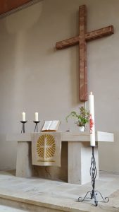 Diesen Karfreitag gilt es auszuhalten, dabei stehen zu bleiben – auch wenn es schwerfällt. Wir können nicht sofort übergehen zu dem „es wird schon“. Wie oft sagen wir leichtfertig „Kopf hoch“, nein, für denjenigen, der unten ist, ganz unten, wird es eben nicht gleich. Mit-gehen, mit-fühlen, da-sein… auch an Karfreitag, auch in der dunklen Zeit. Dabei ist der karge Altar eine Hilfe zur Stärkung, eine Hilfe zum Aushalten des Karfreitags, blicken wir doch konzentriert auf unsere Bibel, auf das Licht, das scheint und auf das Kreuz Jesu.